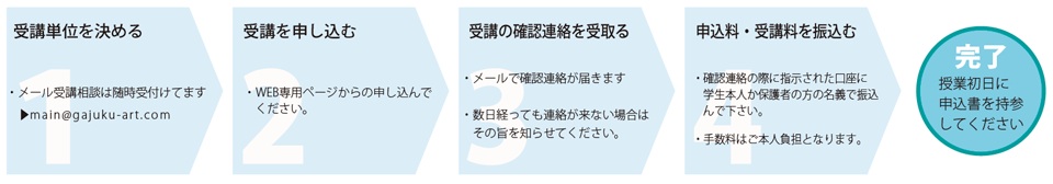 ※申込みの締切日はありませんが、アトリエ定員になり次第締切ります。(各単位16名/受講初日の3日前までに申し込みが必要です)